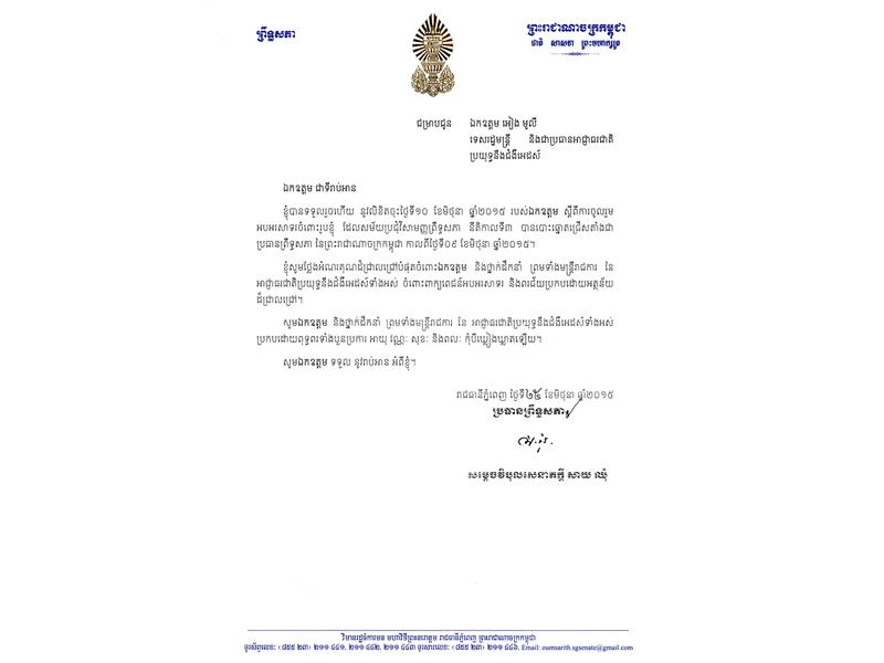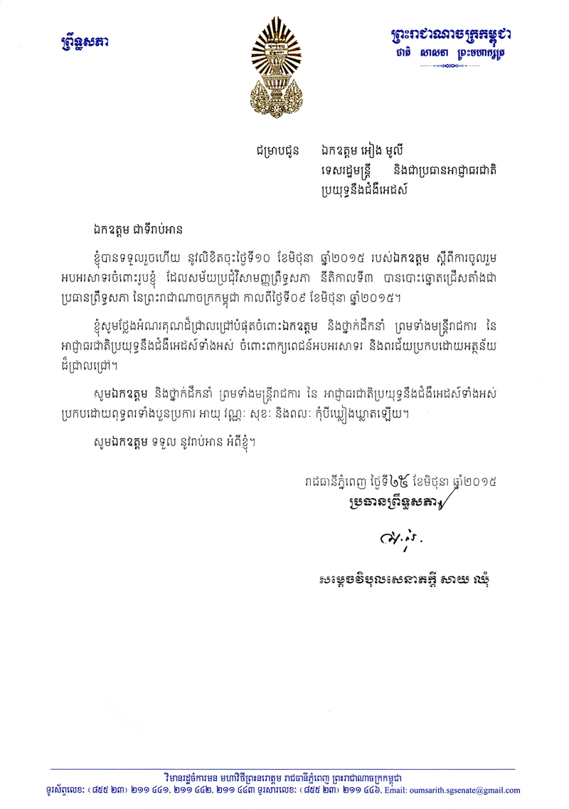 ខាងក្រោមនេះគឺជាសារលិខិតថ្លែងអំណរគុណរបស់ ឯកឧត្តម សាយ ឈុំ ប្រធានព្រឹទ្ធសភា ជូនចំពោះ ឯកឧត្តមទេសរដ្ឋមន្ត្រី អៀង មូលី ប្រធានអាជ្ញាធរជាតិប្រយុទ្ធនឹងជំងឺអេដស៍ក្នុងឱកាសដែលឯកឧត្តមត្រូវបានជ្រើសរើសជាប្រធានព្រឹទ្ធសភានៃព្រះរាជាណាចក្រកម្ពុជា៖