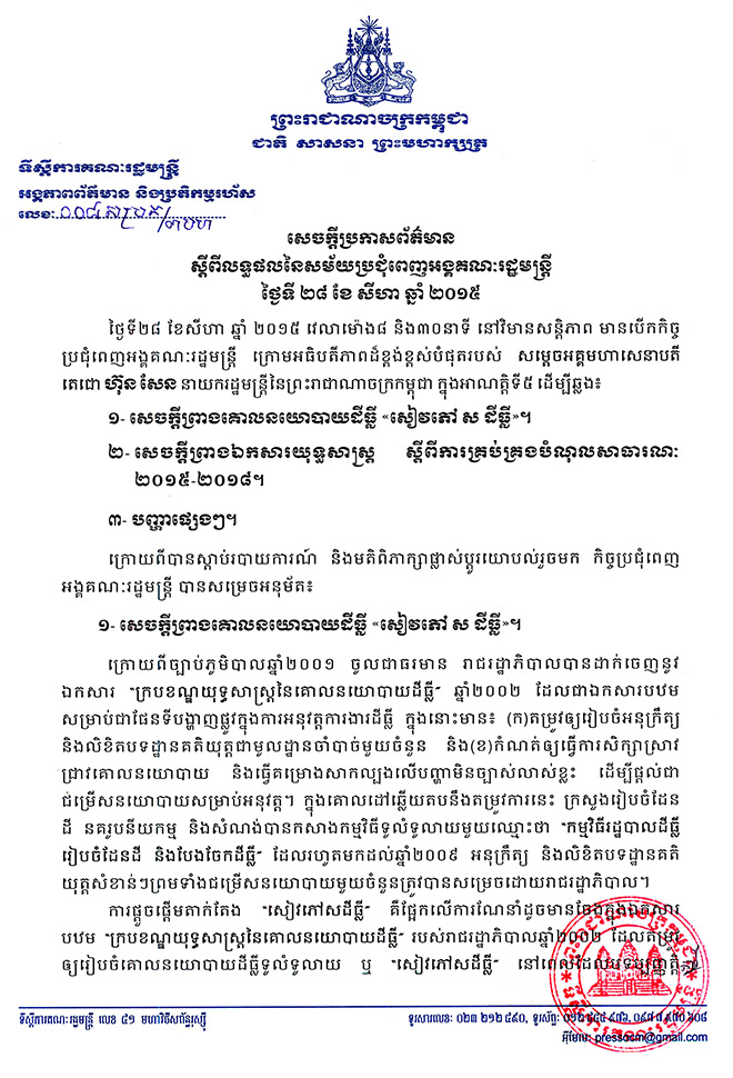 នាព្រឹកថ្ងៃទី ២៨ខែ សីហា ឆ្នាំ ២០១៥ នៅទីស្តីការនាយករដ្ឋមន្រ្តី (វិមានសន្តិភាព) មានការរៀបចំអង្គប្រជុំពេញអង្គគណៈរដ្ឋមន្រ្តី ក្រោមអធិបតីដ៏ខ្ពង់ខ្ពស់របស់ សម្តេចអគ្គមហាសេនាបតីតេជោ ហ៊ុន សែននាយករដ្ឋមន្រ្តីនៃព្រះរាជាណាចក្រកម្ពុជា ដោយមានការចូលរួមពី ឯកឧត្តម និង លោកជំទាវ ជាសមាជិកគណៈរដ្ឋមន្រ្តី ។