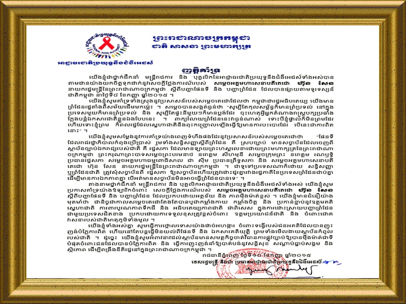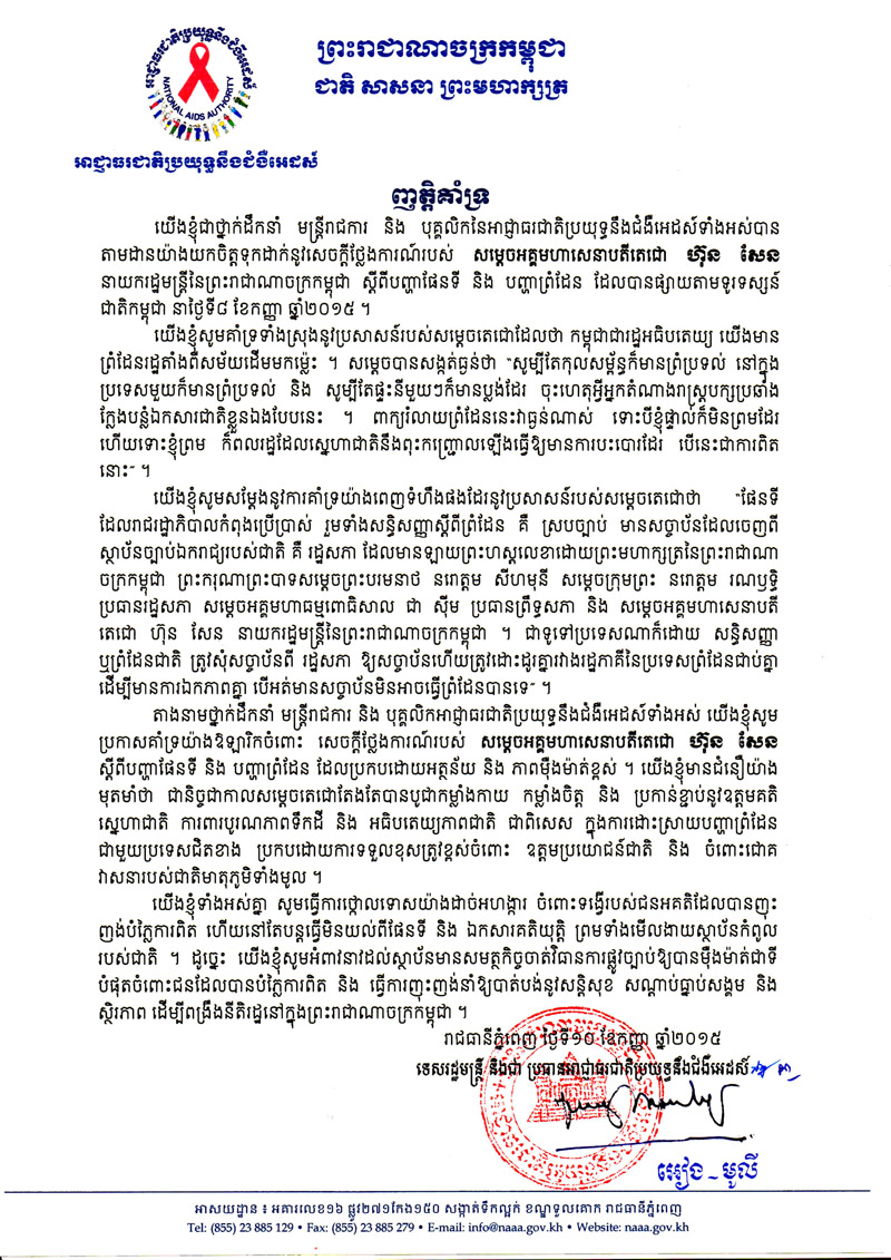 ថ្នាក់ដឹកនាំ មន្ដ្រីរាជការ និងបុគ្គលិក អាជ្ញាធរជាតិប្រយុទ្ធនឹងជំងឺអេដស៍ បានធ្វើញត្ដិគាំទ្រប្រសាសន៍ សម្ដេចអគ្គមហាសេនាបតីតេជោ ហ៊ុន សែន ស្ដីពីបញ្ហាផែនទី និងបញ្ហាព្រំដែន ដែលបានចាក់ផ្សាយតាមទូរទស្សន៍ជាតិកម្ពុជាកាលពីថ្ងៃទី៨ ខែកញ្ញា ឆ្នាំ២០១៥។