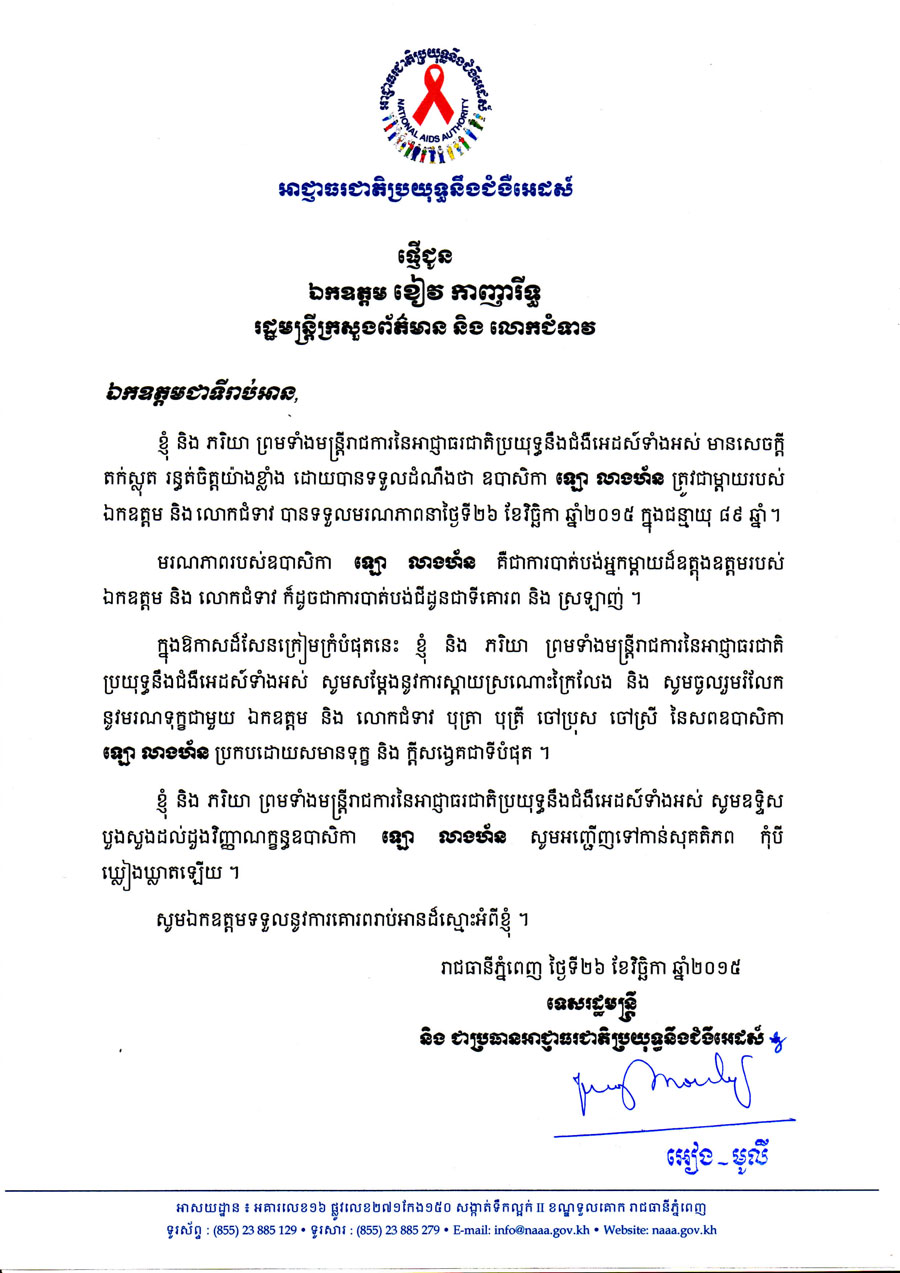 ឯកឧត្តម អៀង មូលី ទេសរដ្ឋមន្រ្ដី និងជាប្រធានអាជ្ញាធរជាតិប្រយុទ្ធនឹងជំងឺអេដស៍ ផ្ញើលិខិតចូលរួមរំលែកទុក្ខមរណភាពរបស់ ឧបាសិកា ឡោ លាងហ័ន ត្រូវជាម្ដាយរបស់ ឯកឧត្តម ខៀវ កាញារិទ្ធ រដ្ឋមន្រ្ដីក្រសួងព័ត៌មាន និងលោកជំទាវ