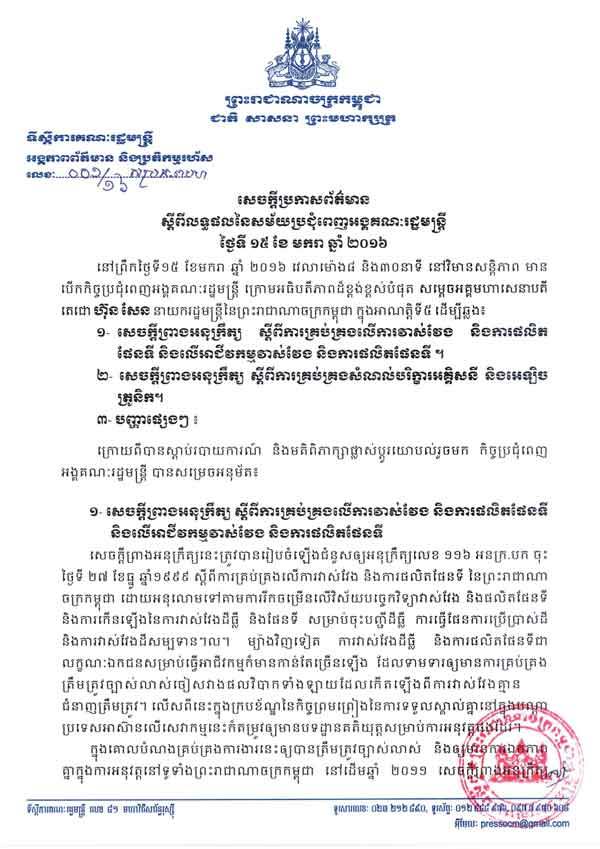 នា ព្រឹកថ្ងៃទី ១៥ ខែ មករា ឆ្នាំ ២០១៦ នៅទីស្តីការនាយករដ្ឋមន្រ្តី ( វិមានសន្តិភាព ) មានការរៀបចំអង្គប្រជុំ