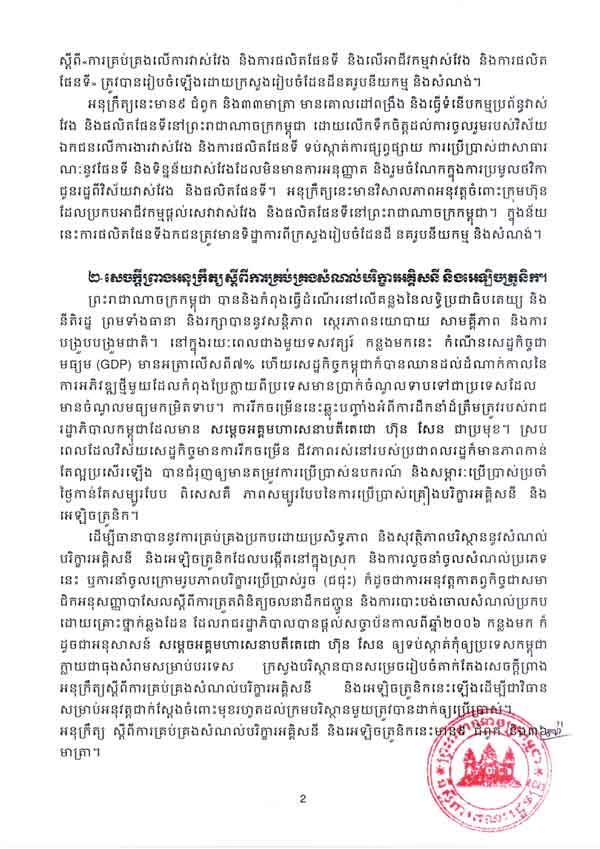 ២- សេចក្តីព្រាងអនុក្រិត្យ ស្ដីពី ការគ្រប់គ្រងសំណល់បរិក្ខាអគ្គិសនី និងអេឡិចត្រូនិច ។