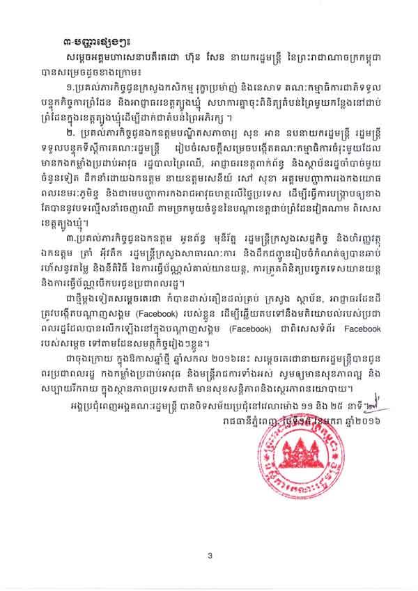 បន្ទាប់ពីការពិភាក្សាផ្លាស់ប្តូរយោបល់យ៉ាងយូរគណៈ រដ្ឋមន្រ្តីបានពិនិត្យអនុម័តលើ សេចក្តីព្រាងច្បាប់ សេចក្តីព្រាងអនុក្រឹត្យនិង ឯកសារខាងលើ។