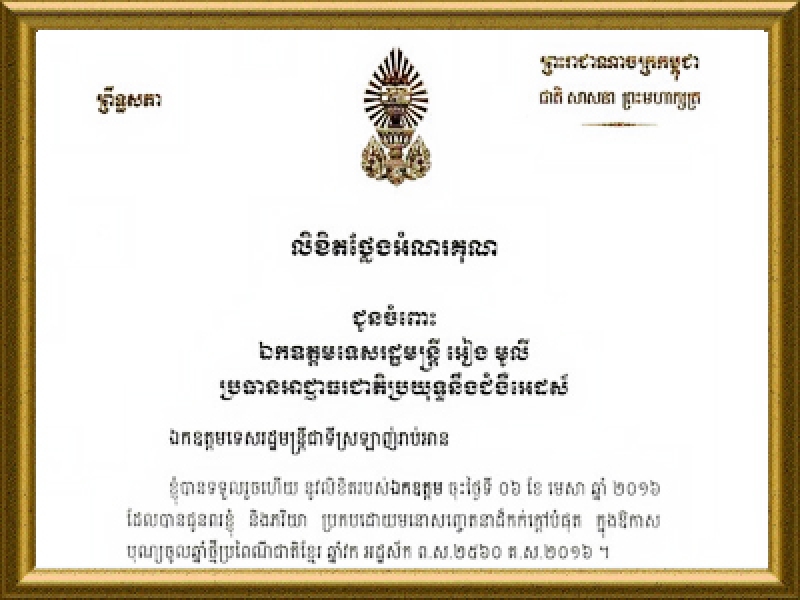 លិខិតថ្លៃងអំណរគុណ ពី សមេ្តចវិបុលសេនាភក្តី សាយ ឈុំ ជូនចំពោះ ឯកឧត្តមទេសរដ្ឋមន្រ្តី