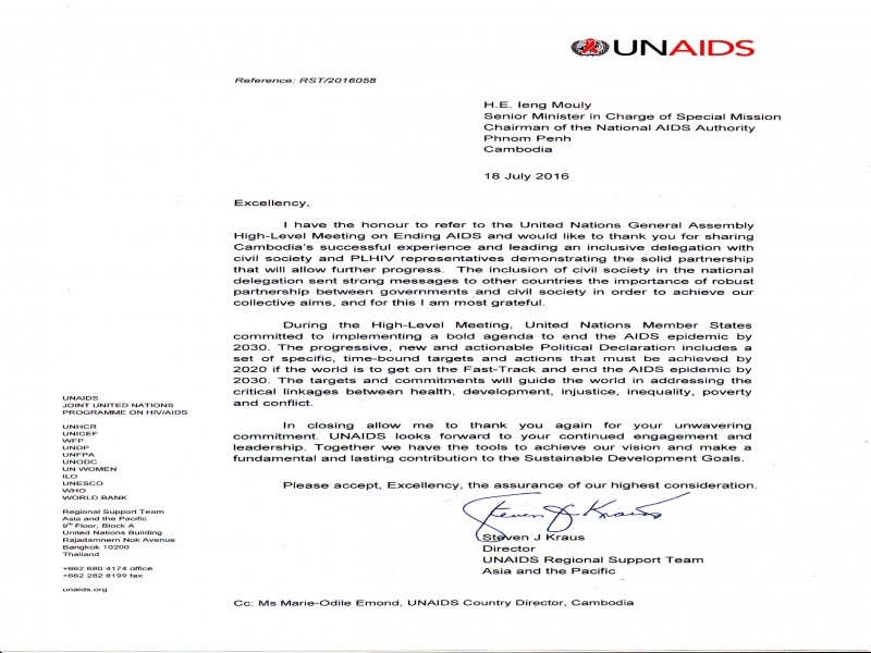 លិខិតលោក Steven Kraus នាយកអង្គការ UNAIDS ប្រចាំតំបន់អាស៊ីប៉ាស៊ីហ្វិក ផ្ញើជូន ឯកឧត្តមទេសរដ្ឋមន្រ្តី អៀង មូលី ប្រធានអាជ្ញាធរជាតិប្រយុទ្ធនឹងជំងឺអេដស៍។