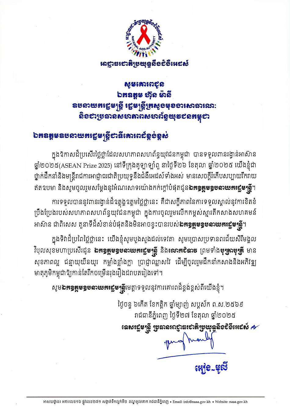 លិខិតអបអរសាទរ ឯកឧត្តម ហ៊ុន ម៉ានី ឧបនាយករដ្ឋមន្ត្រី រដ្ឋមន្ត្រីក្រសួងមុខងារសាធារណៈ និងជាប្រធានសហភាពសហព័ន្ធយុវជនកម្ពុជា បានទទួលពានរង្វាន់អាស៊ាន ឆ្នាំ២០២៥ (ASEAN Prize 2025) នៅទីក្រុងគូឡាឡាំពួ នាថ្ងៃទី២៦ ខែតុលា ឆ្នាំ២០២៥