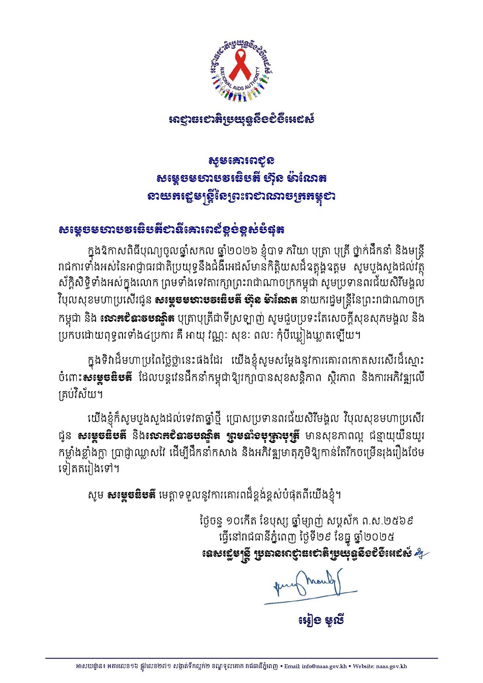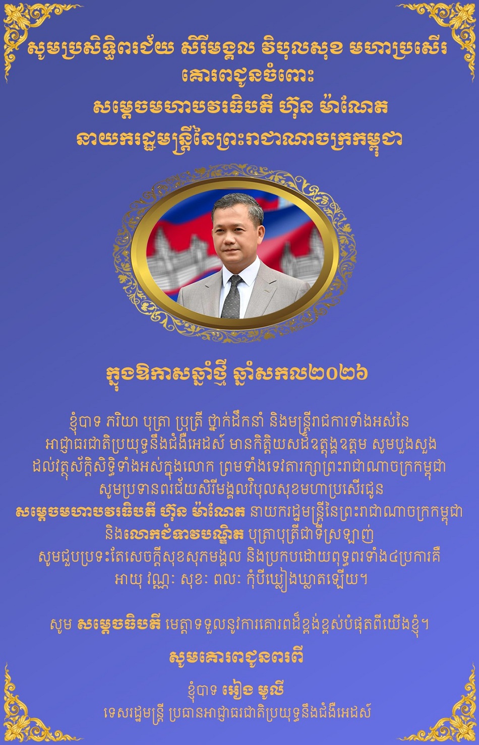 លិខិតគោរពជូនពរសម្ដេចមហាបវរធិបតី ហ៊ុន ម៉ាណែត នាយករដ្ឋមន្រ្តី នៃព្រះរាជាណាចក្រកម្ពុជា និងលោកជំទាវបណ្ឌិត ក្នុងឱកាសពិធីបុណ្យចូលឆ្នាំសកល ឆ្នាំ២០២៦