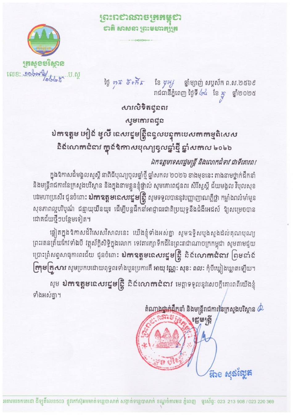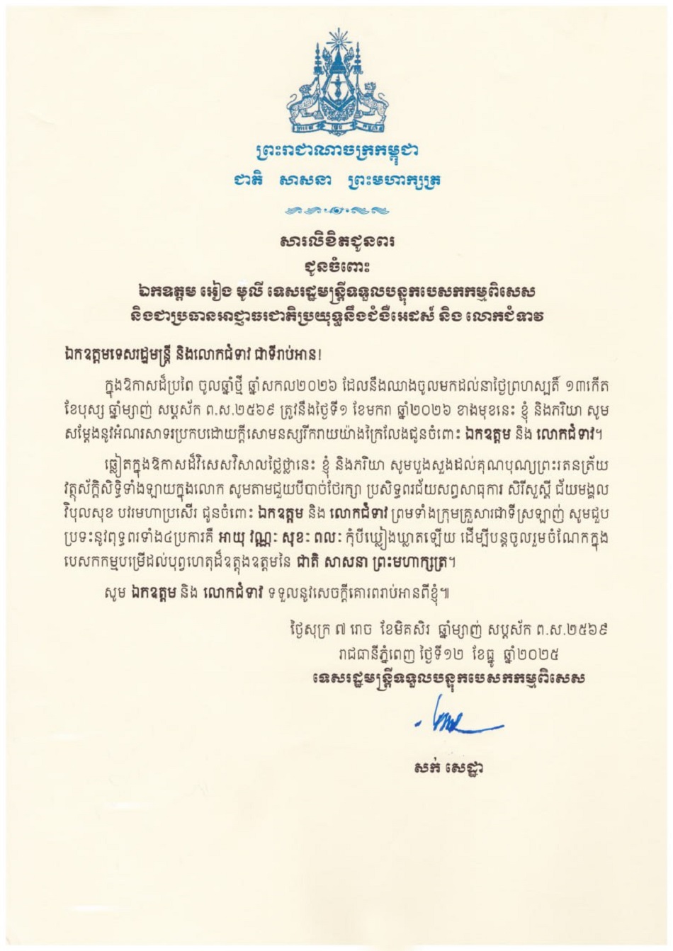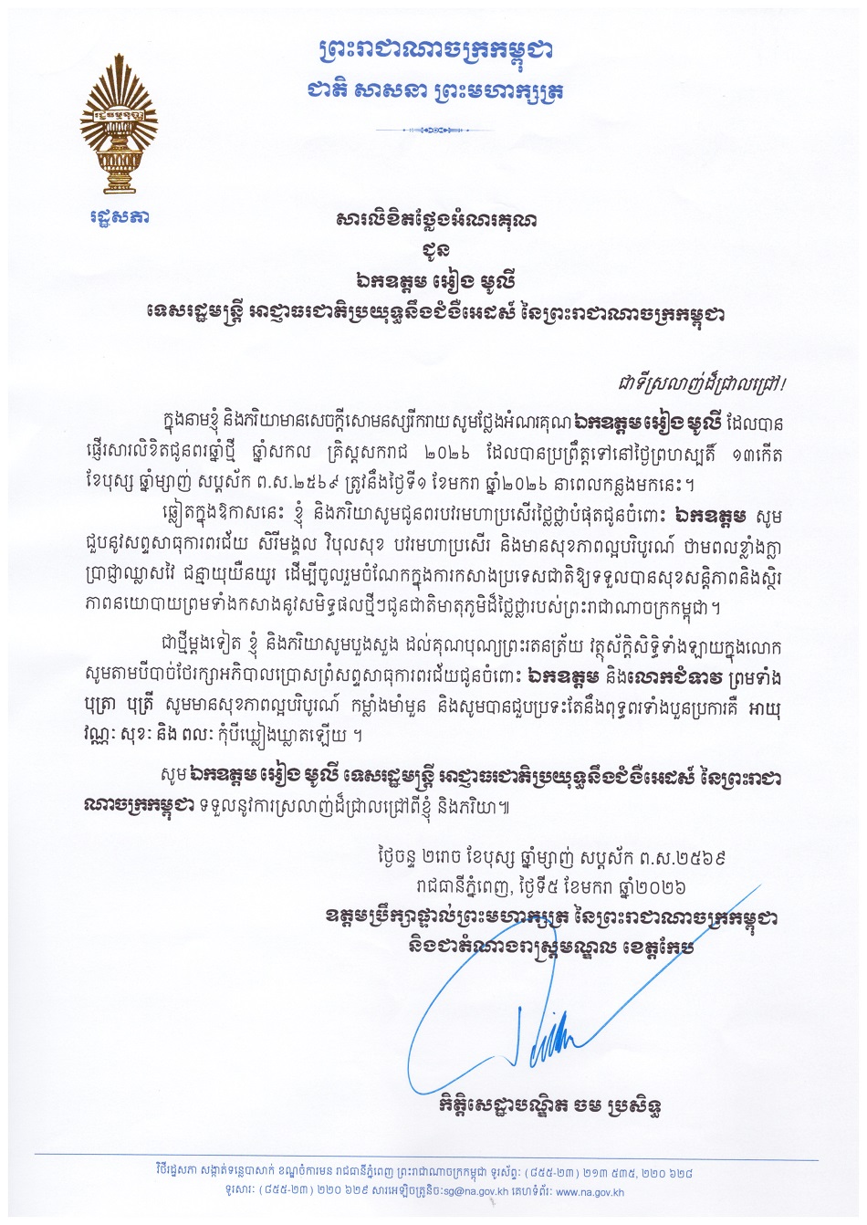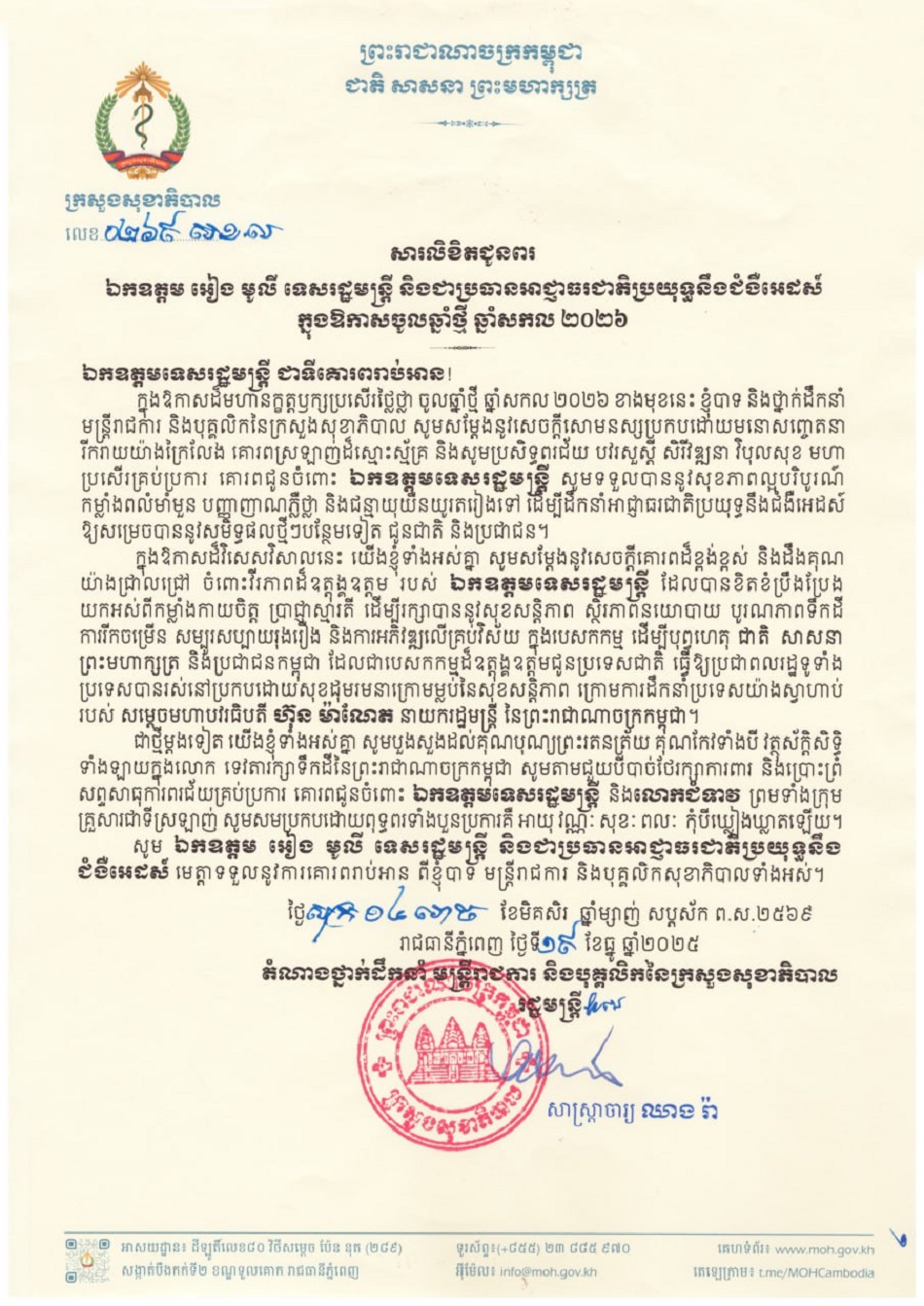 សារលិខិតជូនពរ ផ្ញើជូន ឯកឧត្តមទេសរដ្ឋមន្ត្រី អៀង មូលី ប្រធានអាជ្ញាធរជាតិប្រយុទ្ធនឹងជំងឺអេដស៍ ក្នុងឱកាសពិធីបុណ្យចូលឆ្នាំសកល ឆ្នាំ២០២៦