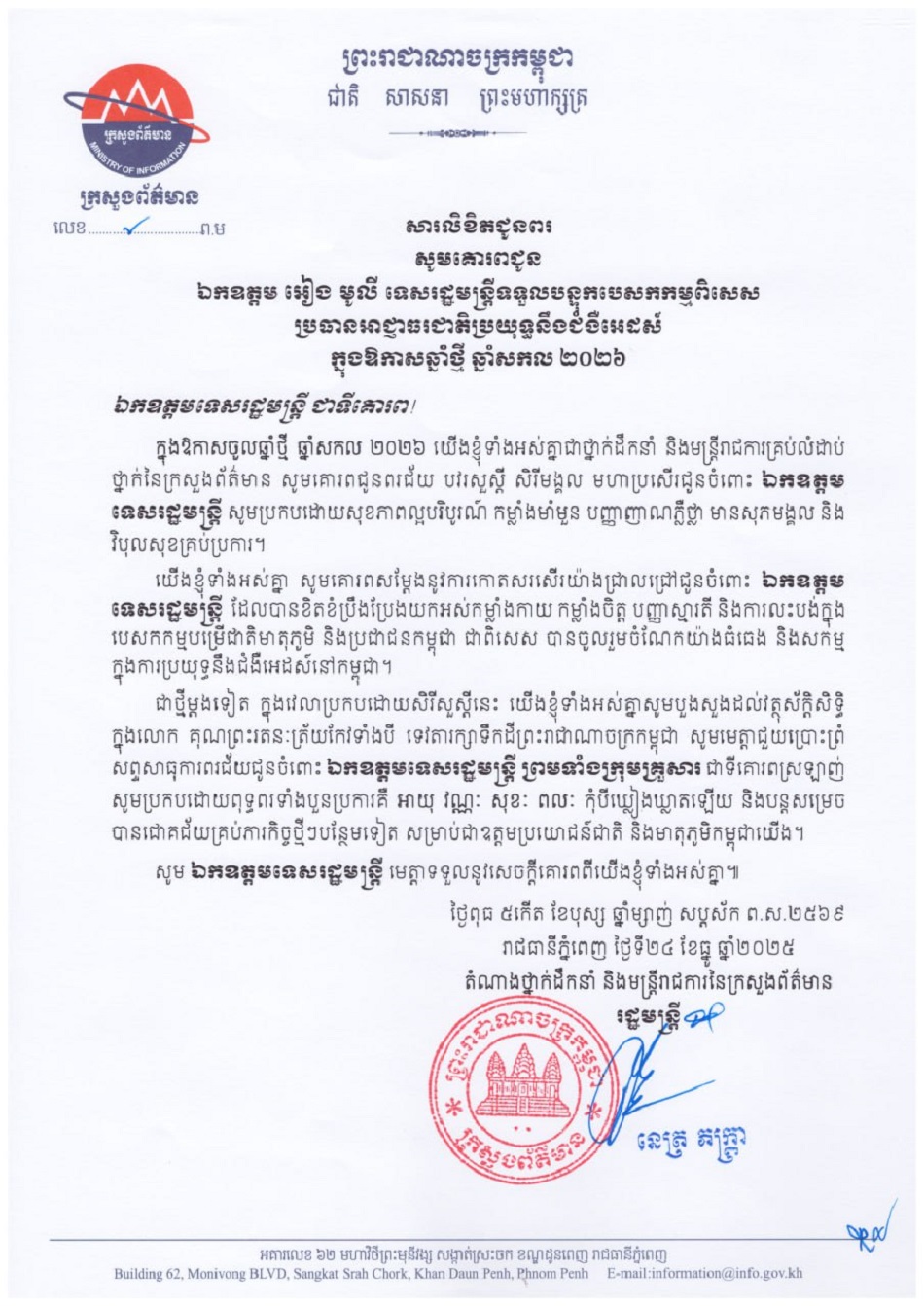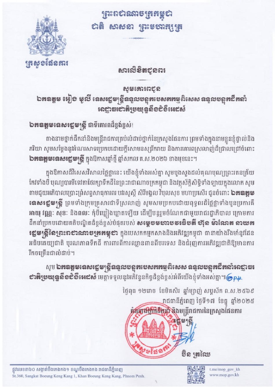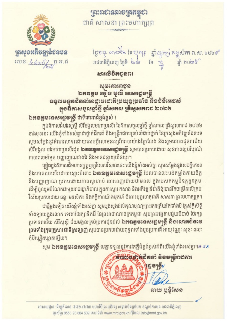 សារលិខិតជូនពរ ផ្ញើជូន ឯកឧត្តមទេសរដ្ឋមន្ត្រី អៀង មូលី ប្រធានអាជ្ញាធរជាតិប្រយុទ្ធនឹងជំងឺអេដស៍ ក្នុងឱកាសពិធីបុណ្យចូលឆ្នាំសកល ឆ្នាំ២០២៦