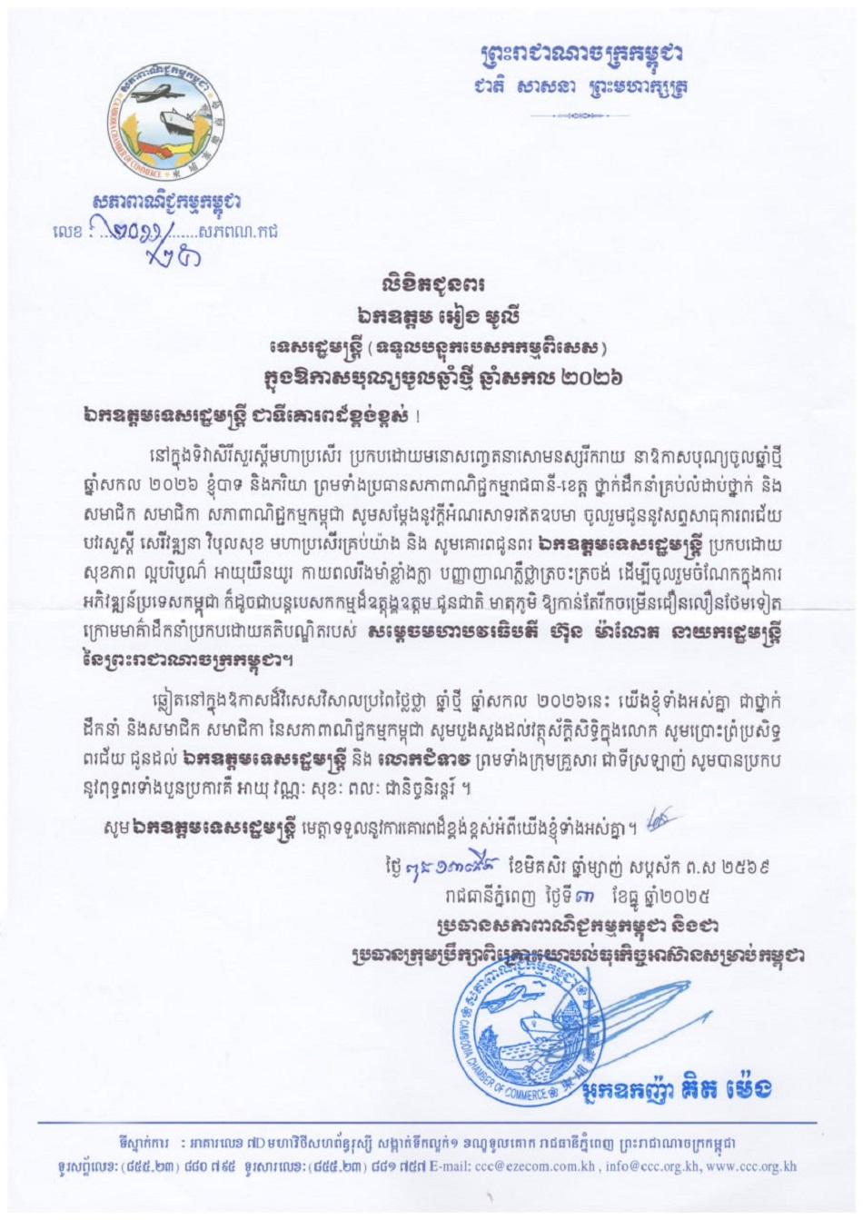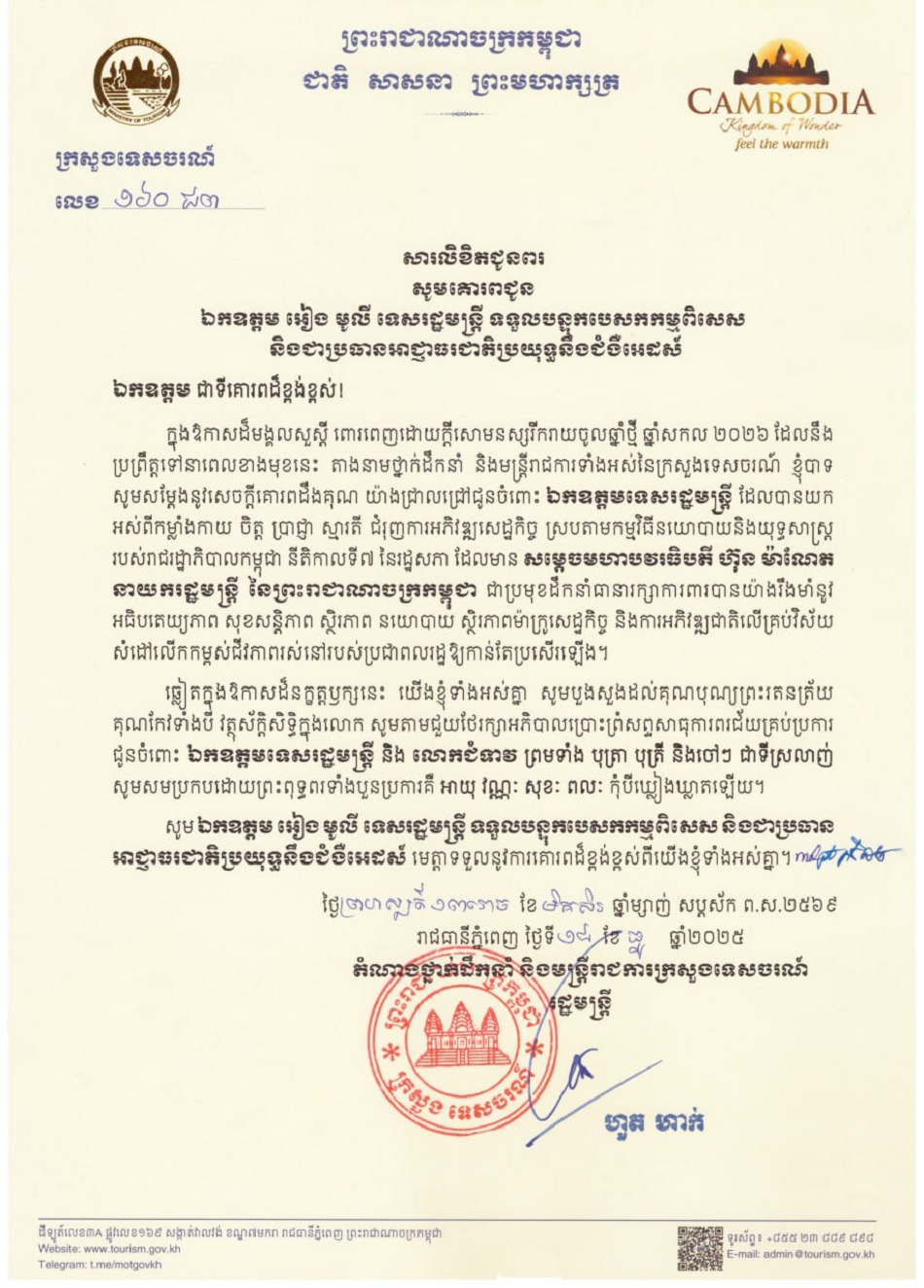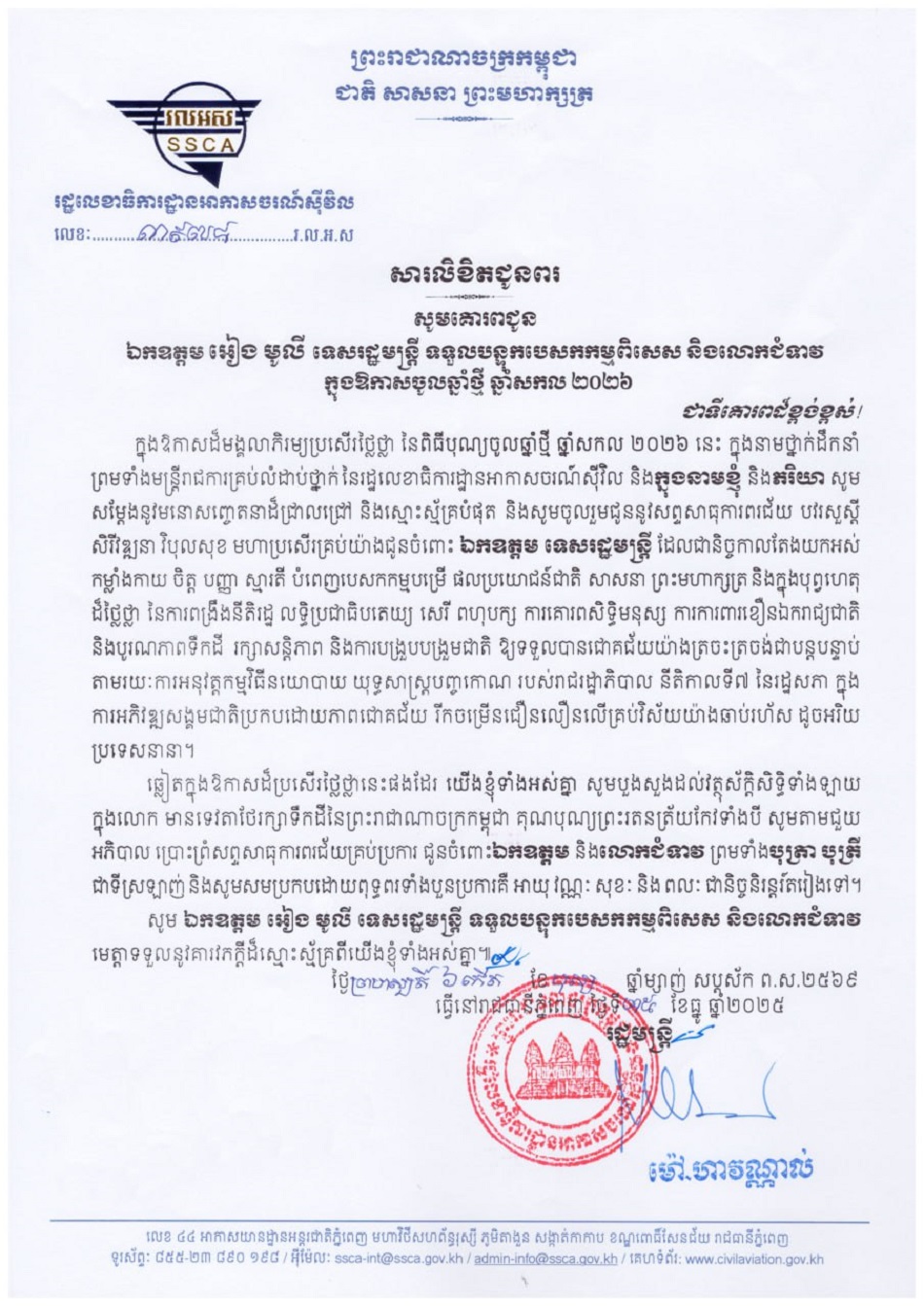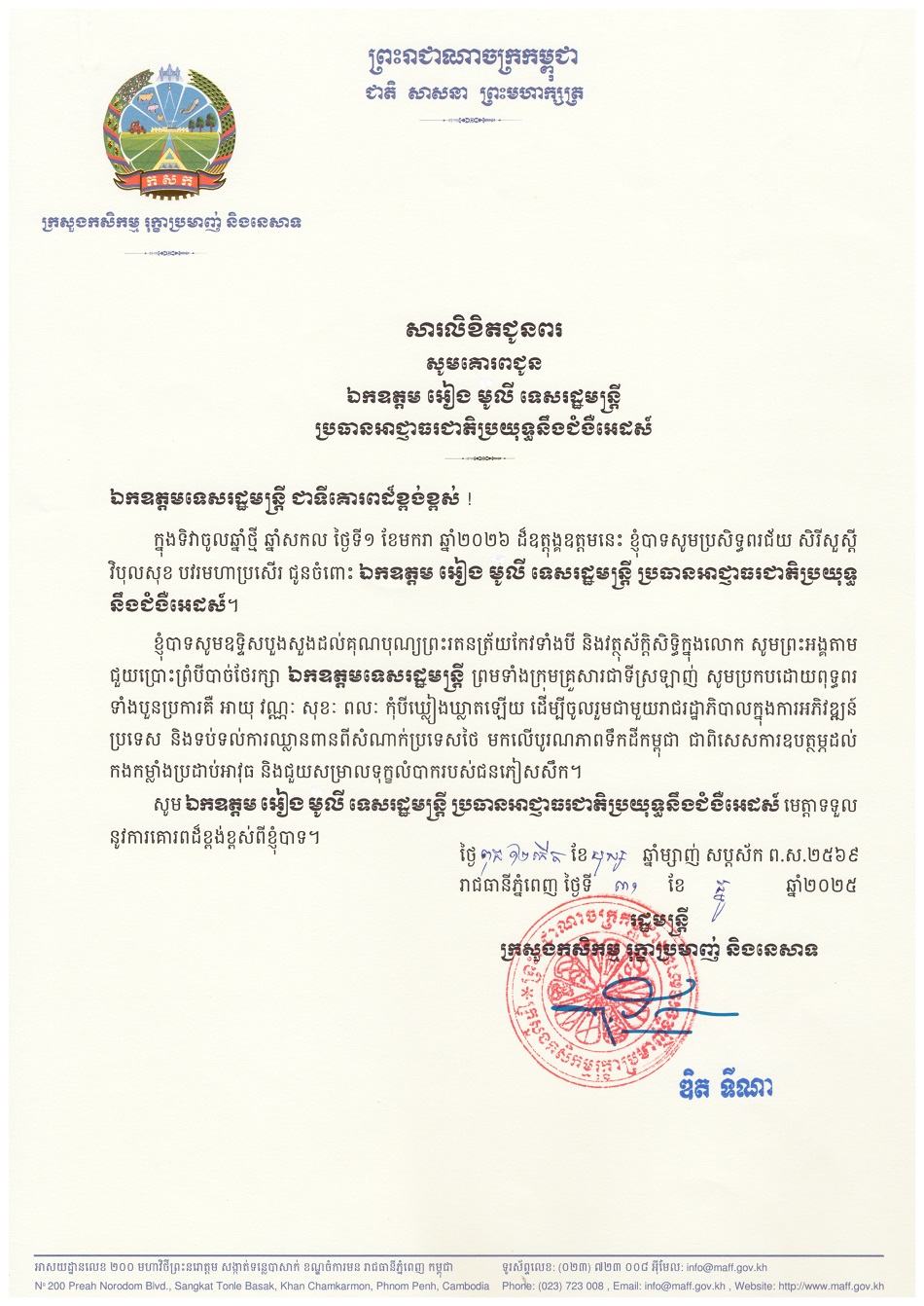 សារលិខិតជូនពរ ផ្ញើជូន ឯកឧត្តមទេសរដ្ឋមន្ត្រី អៀង មូលី ប្រធានអាជ្ញាធរជាតិប្រយុទ្ធនឹងជំងឺអេដស៍ ក្នុងឱកាសពិធីបុណ្យចូលឆ្នាំសកល ឆ្នាំ២០២៦