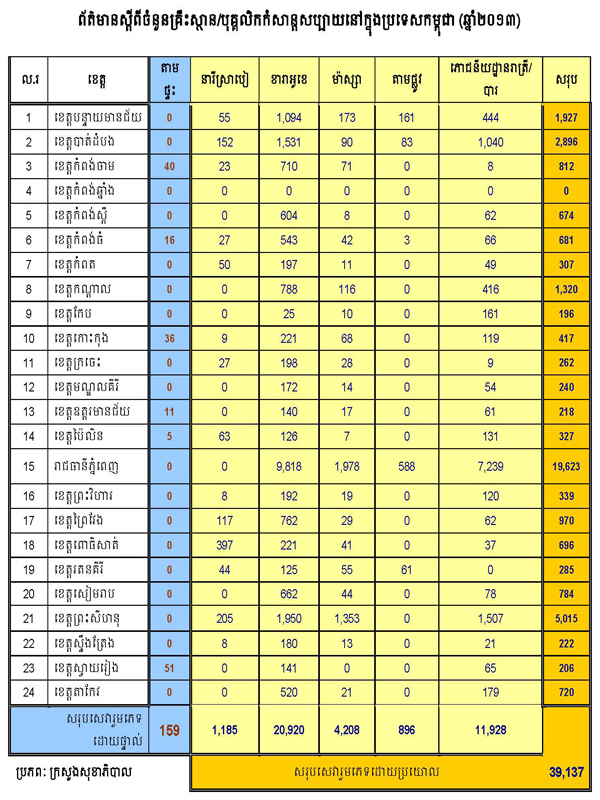 ព័ត៌មានស្តីពីចំនួនគ្រឹះស្ថាន/បុគ្គលិកកំសាន្តសប្បាយនៅក្នុងប្រទេសកម្ពុជា (ឆ្នាំ២០១៣) | 0.03 MB | ![]() |